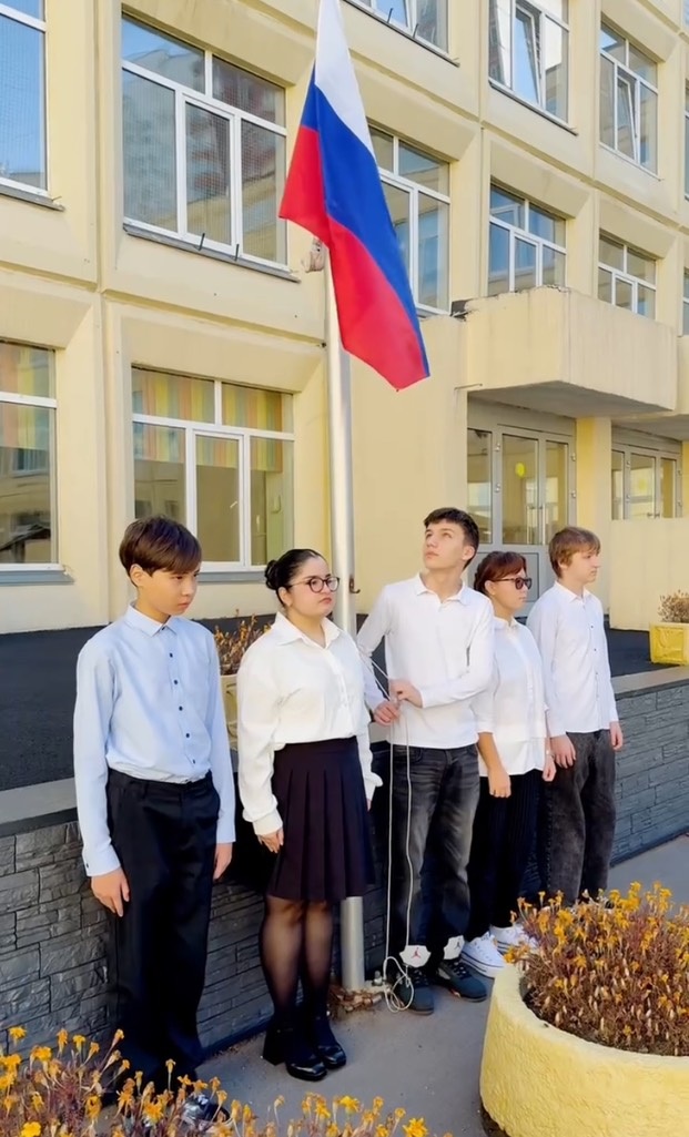 Команда наших активистов, учеников 8 и 9 классов- Эльдар, Дмитрий, Дипика, Магомед, Лидия подняли флаг нашей страны. Всю неделю он будет радовать всех нас своей красотой и величием!